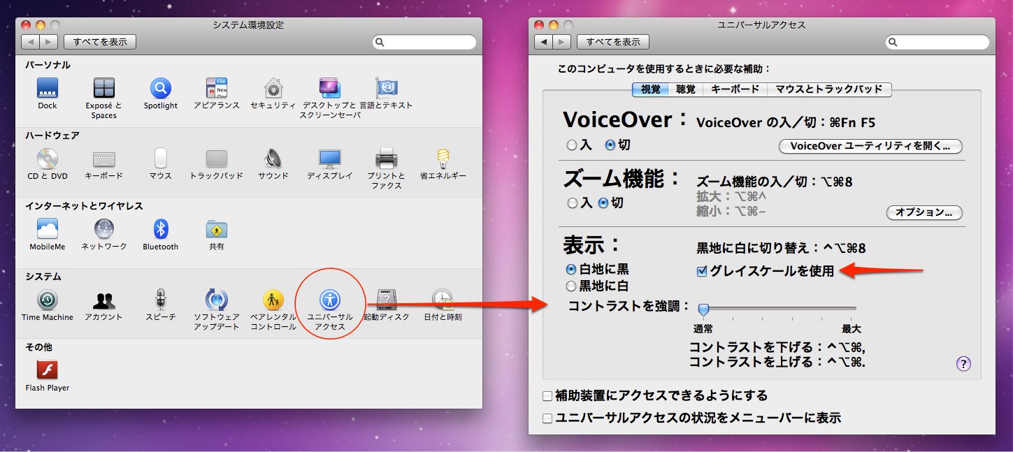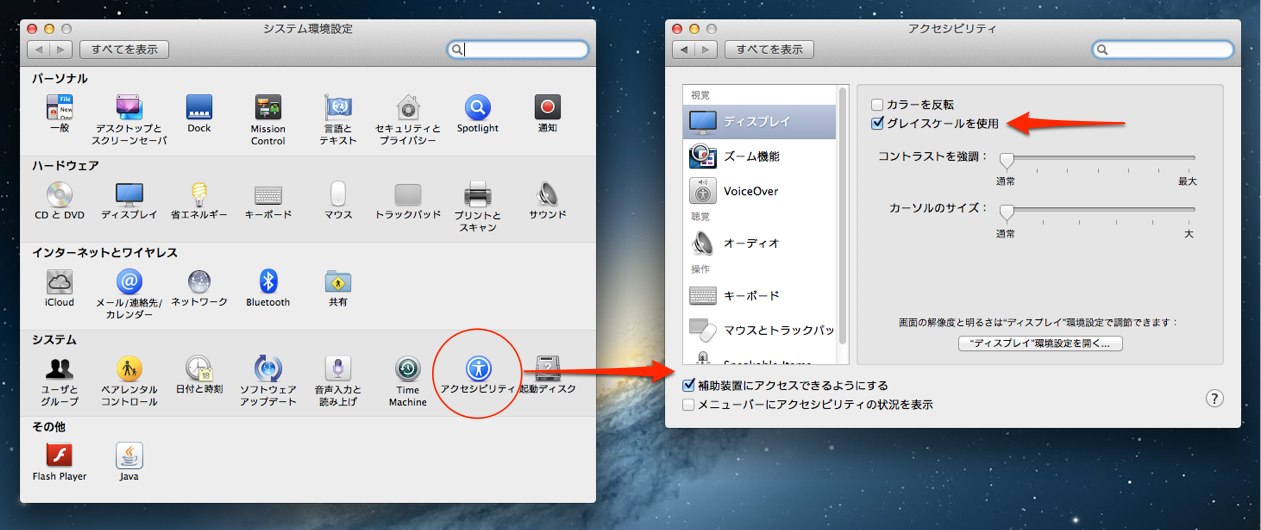 環境設定→ユニバーサルアクセス→グレースケールを使用