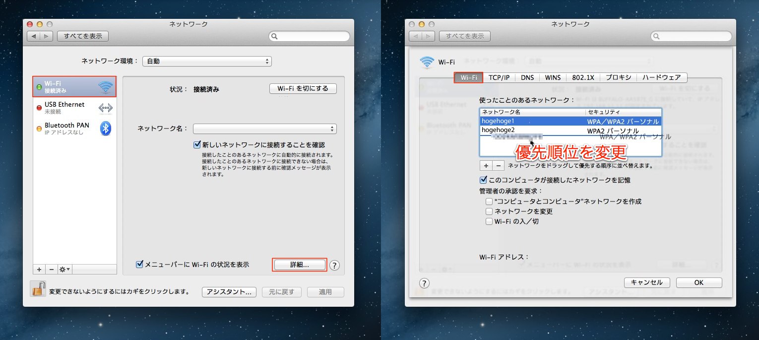 [システム環境設定]▶[ネットワーク]▶Wi-Fiサービスを選択▶[詳細]▶