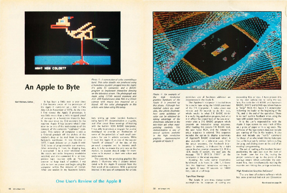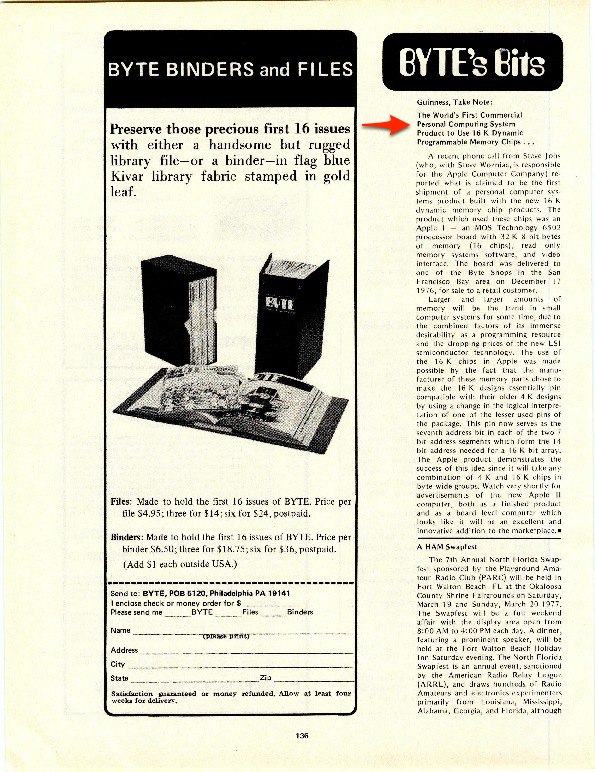 まずはこの小さな囲み記事から。初めてByte誌がアップル社に触れた記事。1977年3月号。