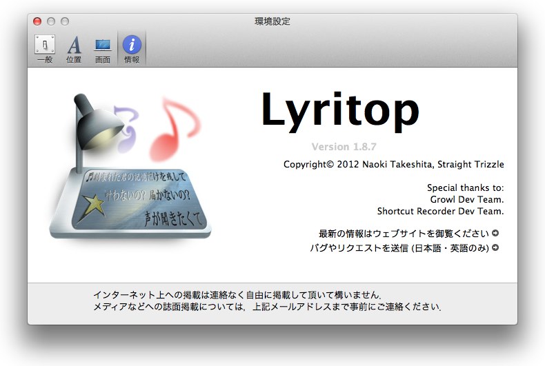 LyritopはiTunesで再生中の曲の歌詞をデスクトップ上に表示できるアプリです。