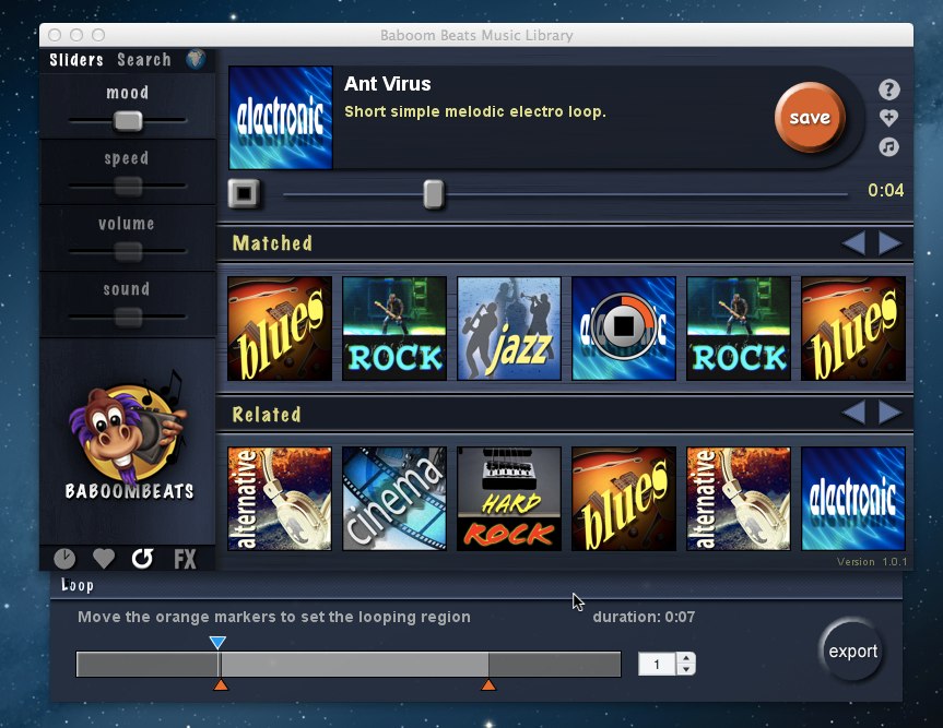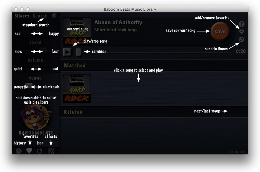 Baboom Beatsはロイヤリティフリーの曲が収められたBGM作成アプリです。