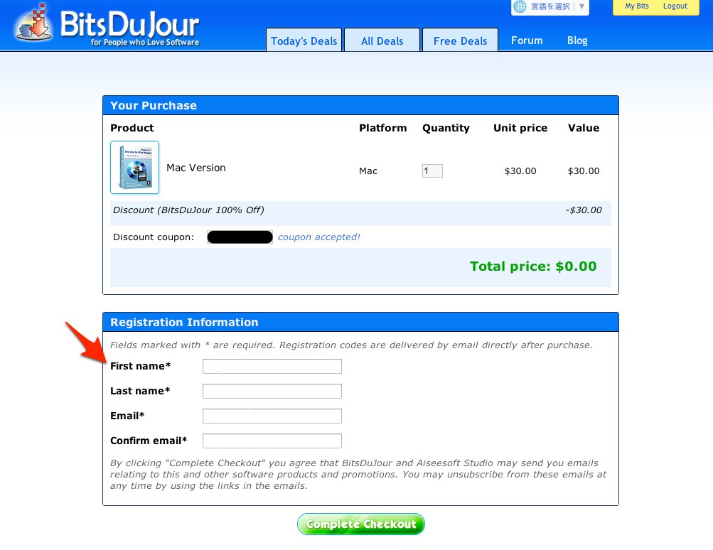BitDuJourのサイトから[Get It For Free]で購入ページヘ進みメールアドレスを登録。