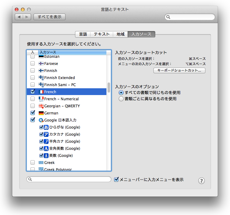 使い方はシステム環境設定.appから[言語とテキスト]→[入力ソース]と選択し、複数の入力言語を選択します。