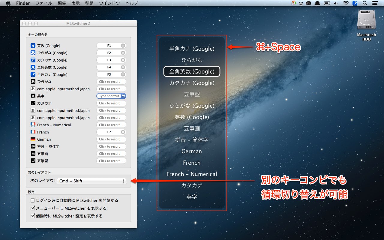 次にMLSwitcherを起動して好きな言語にショートカットキーを割り当てます。これでショートカットキー1つで好きな言語に切り替えが可能です。