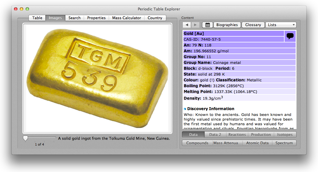 元素周期表から元素を選ぶとその元素のイメージや電子殻、原子容、モル質量、密度、融点、発見日、原産地などの詳しいデータが見れます。