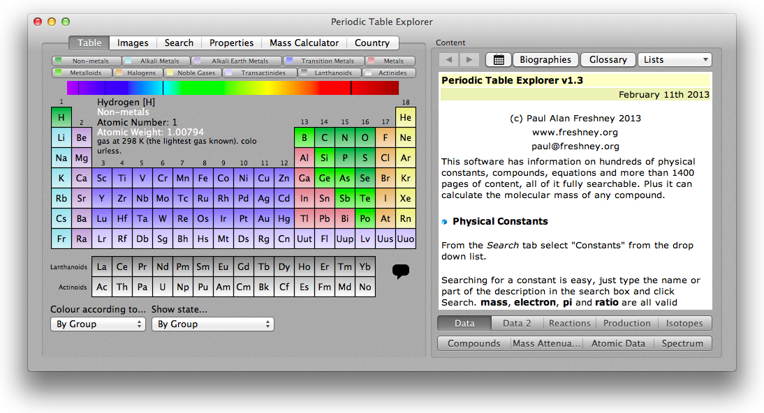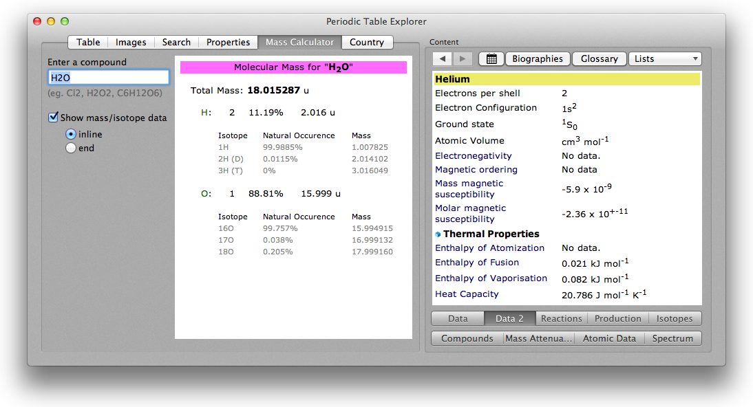 その他にも質量や原子状態、電子数などで検索、産出国データ、分子容量計算機の機能もあるそうです。