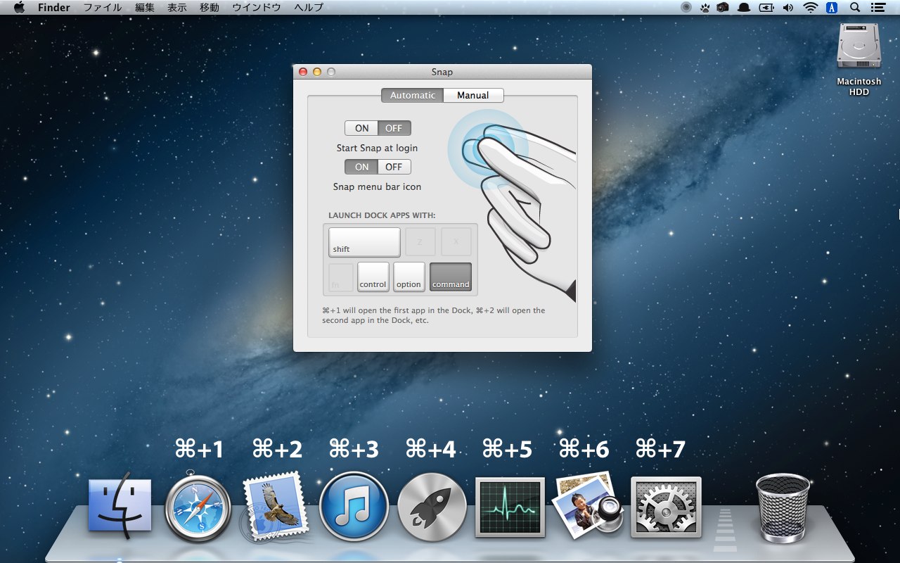 SnapはDockアプリにショートカットキーを設定できるアプリです。