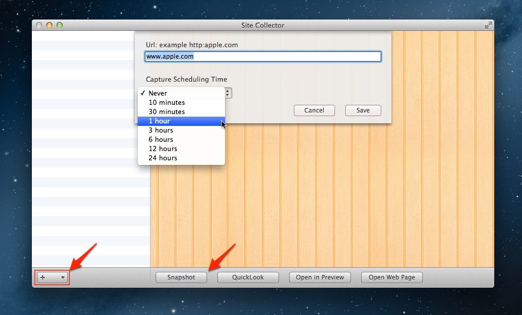 使い方は左隅の[Add Site]でスクリーンショットを撮りたいサイトのURLを入力し[Snapshot]ボタンを押すだけです。また、一定時間間隔でキャプチャしたい場合は10 ,30 minutes, 1, 3, 6, 12, 24 hoursから選択します。