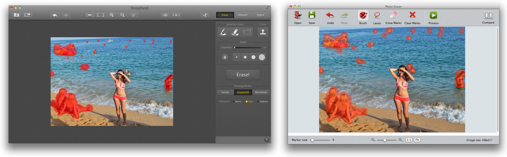 同様のアプリに「Snapheal」がありますが、モード(アルゴリズム)やレタッチ機能がない分、機能や精度は劣りますが一応同様の事が出来ます。