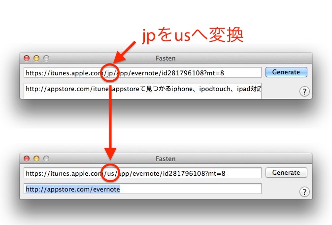 使い方は上の欄にitunes.apple.comのURLを入力して[Generate]ボタンを押すだけですが、ディレクトリ階層にjpが入っているときちんと変換してくれない場合があるので、その時はusへの変換が必要です。