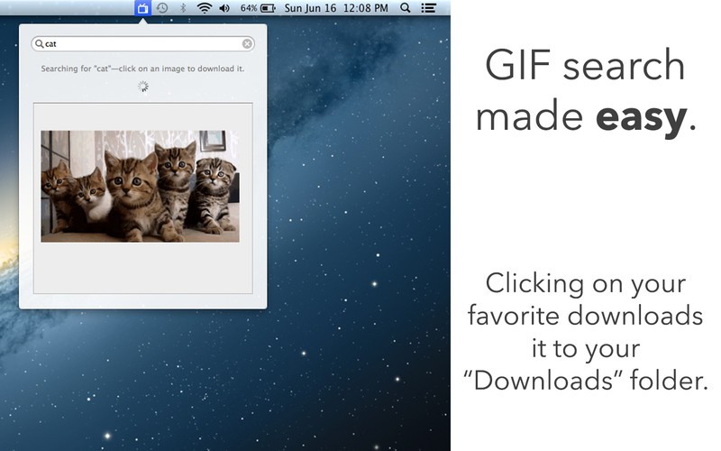 使い方はアプリを起動してメニュバーにあるアイコンからキーワードを入力して検索するだけで多数のGIFアニメが閲覧出来ます。(*日本語で検索すると落ちます)