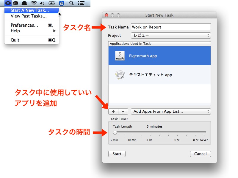 2.タスク名を決定してタスク中に使用していいアプリをリストに追加していきます