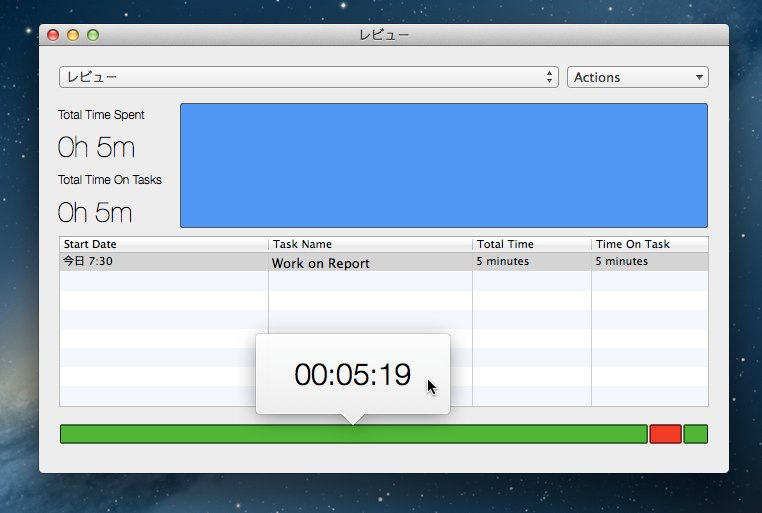 終了したタスクは[View Past Tasks…]から仕事した時間(決められたアプリで作業した時間が緑、その他が赤)が閲覧出来ます。