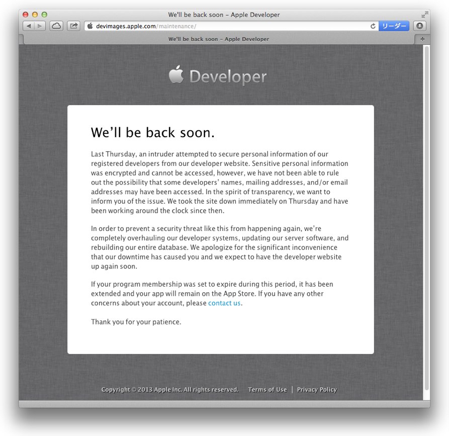 appleのデベロッパーサイト昨日からWe’ll be back soonのままなんですが、