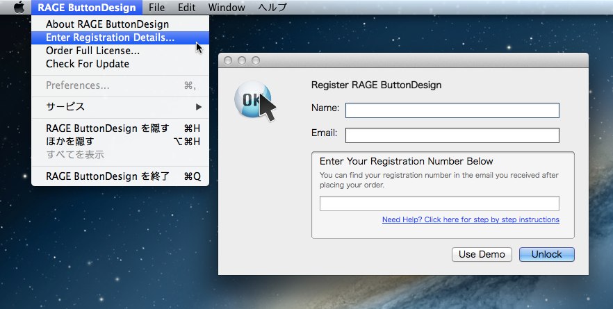 プロモーションで手に入れた方はメニューバーから[Enter Registration Details]で全機能を使用できるようになります。