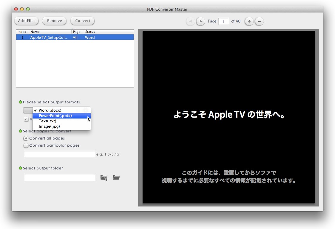 使い方は変換したいPDFファイルを[Add Files]かドラッグ&ドロップし、変換したいフォーマット(.docx, .txt, .pptx, .jpg)、変換したいページを選択し[Convert]ボタンを押すだけです。