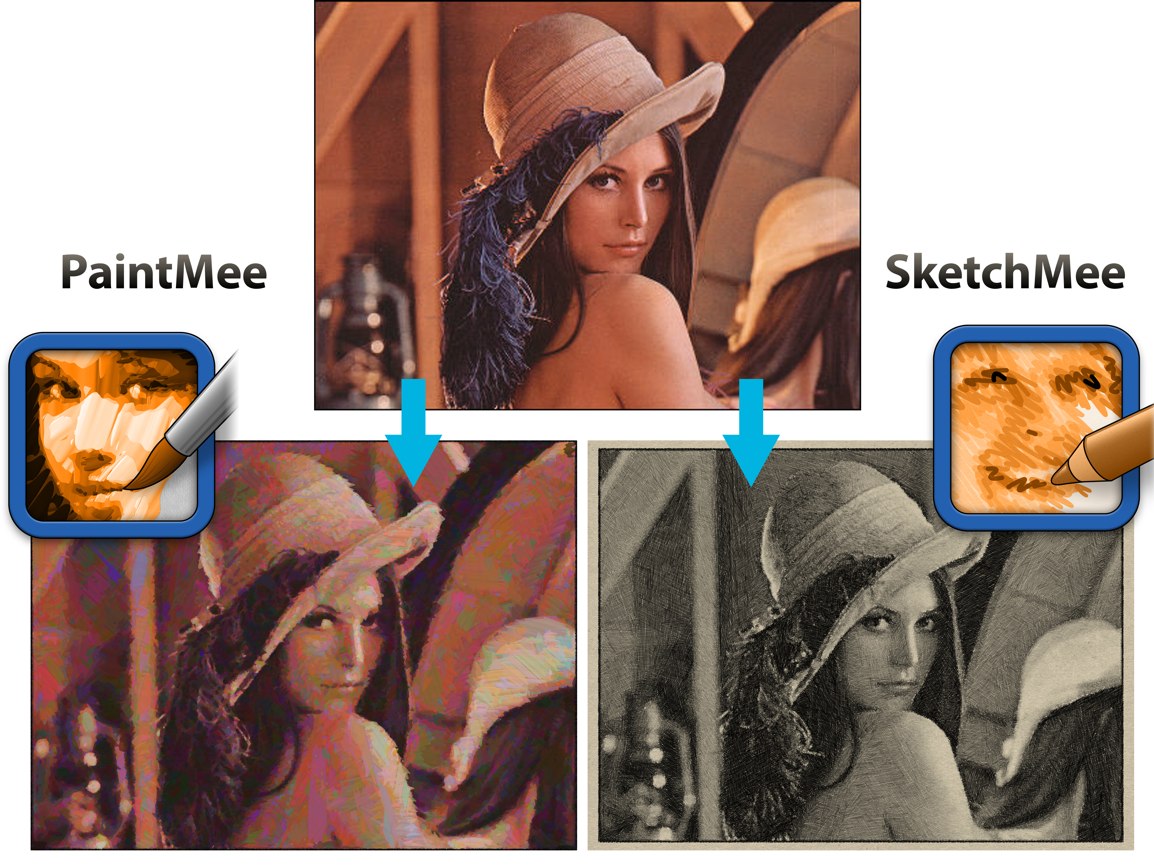 PaintMeeは写真をカラーの油絵で描いた様に、SketchMeeは写真を鉛筆のスケッチイメージにの様に変換してくれるアプリです。