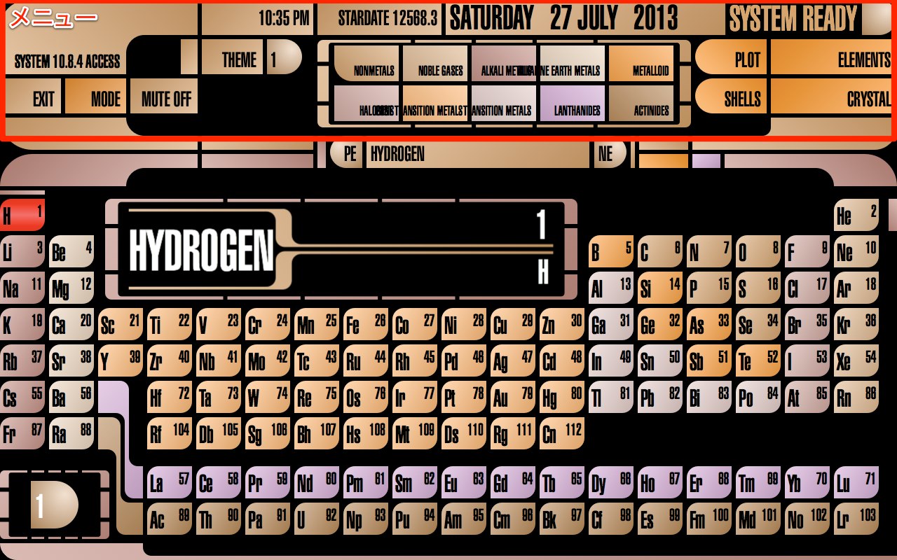 カラーデザインはいくつかプリセットされていて、また[Esc]キーで3D結晶構造を全画面表示にしたり、[Space]キーで回転している電子各構造を止めたりも出来ます。