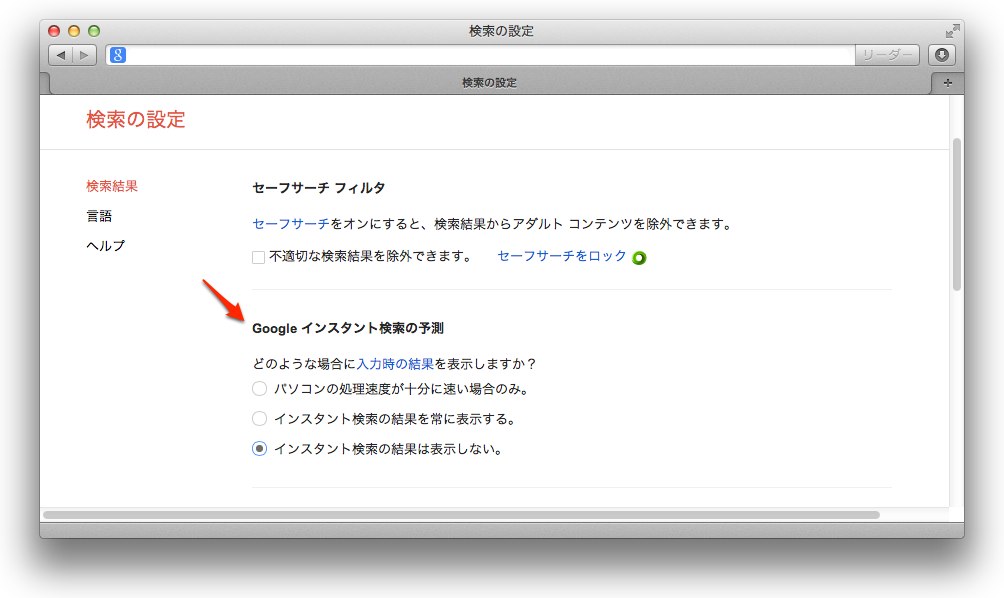 3.Googleの場合は「検索設定→Googleインスタント検索の予測」を切る