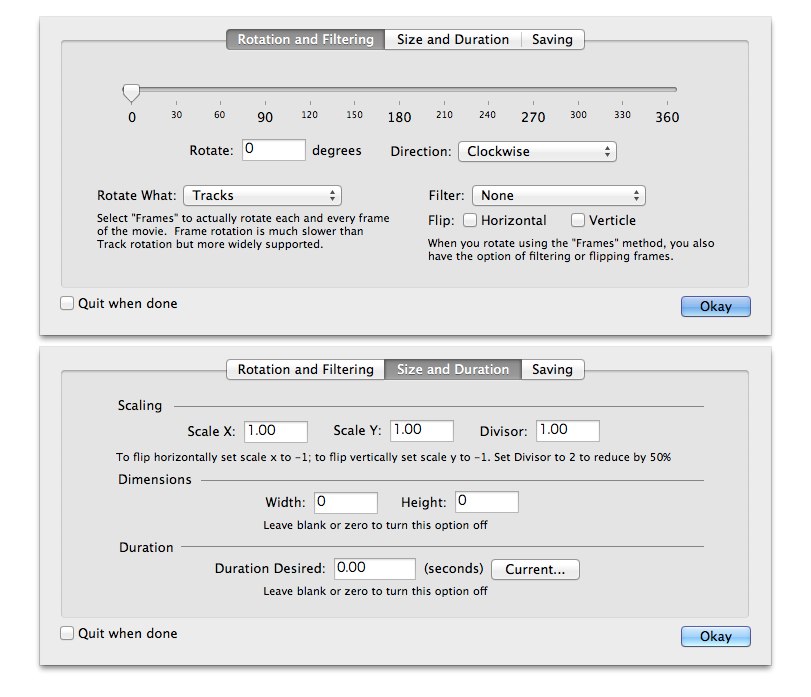 使い方は[Preferences…]ボタンから[Rotation and Filtering][Size and Duration]から回転したい角度やトリミング範囲、かけたいエフェクトを設定します。