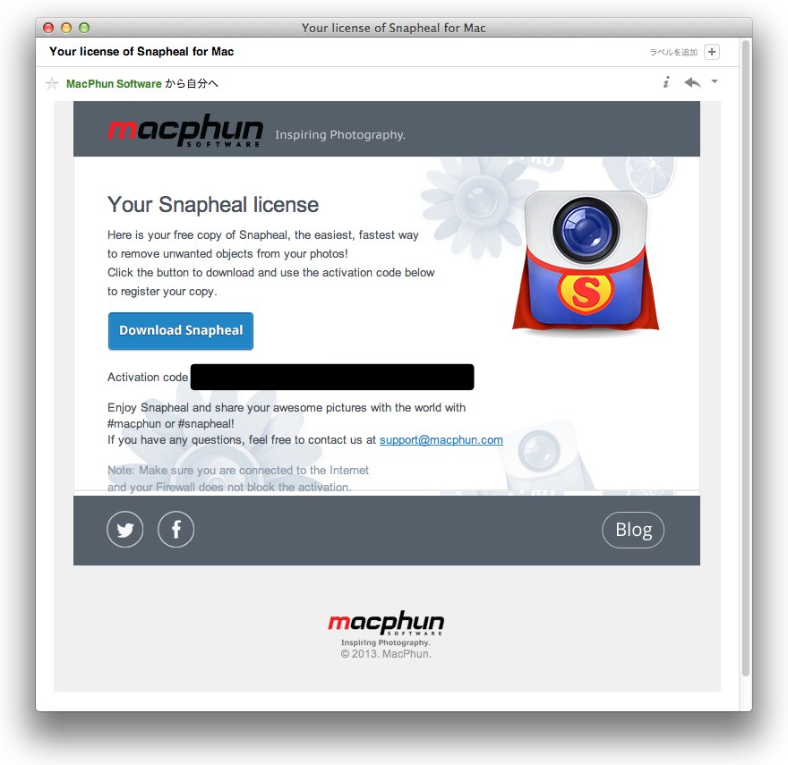4.後はダウンロード&インストールしたSnaphealを起動して、起動画面の[Activate…]ボタンからメールアドレスとActivation Codeを入力すればFull Versionとして使えます。