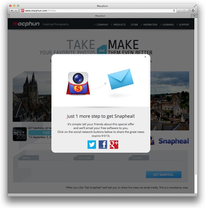 1.公式サイトfreebieページで名前、メールアドレス、国を入力して[GET SNAPHEAL]。
