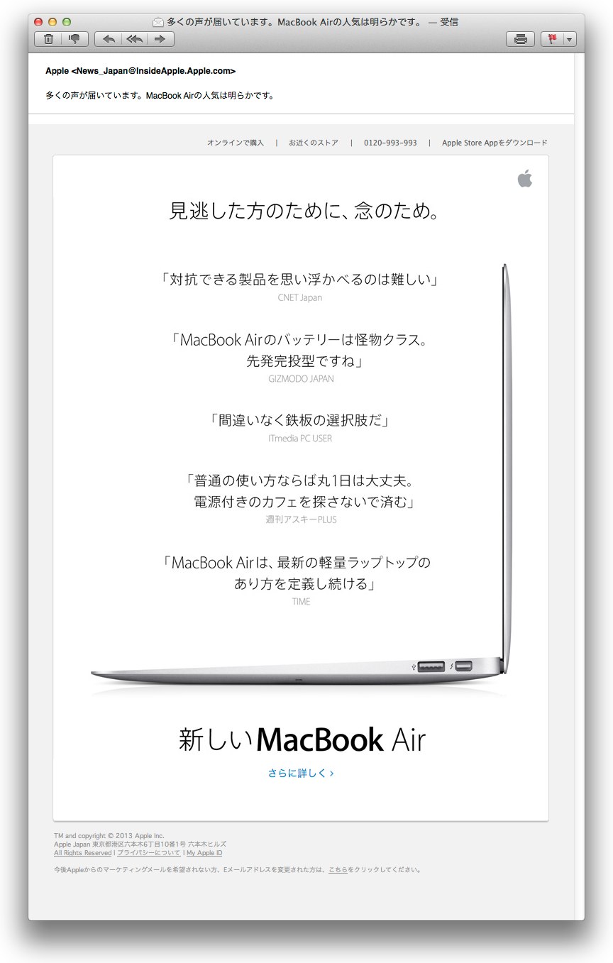 そうなんです~!嬉しくて嬉しくて…!RT @miso_siru: @gizmodojapan Appleから届いたMBAの広告メールにgizmodo japanさんのお言葉が!w