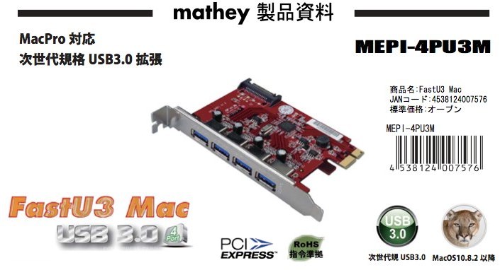 ・MacOS10.8.2以降を搭載したMacProに対応し、最新のUSB3.0インターフェイスを増設する際に最適なソリューション。