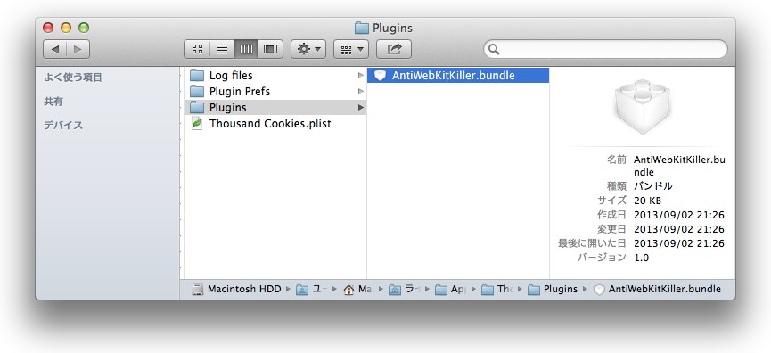 プラグインの使い方はThousandのサイトから「アンチWebKitキラープラグイン」をダウンロード&解凍して、[~/Library/Application Support/Thousand/Plugins](無ければ作成)に置くだけです。
