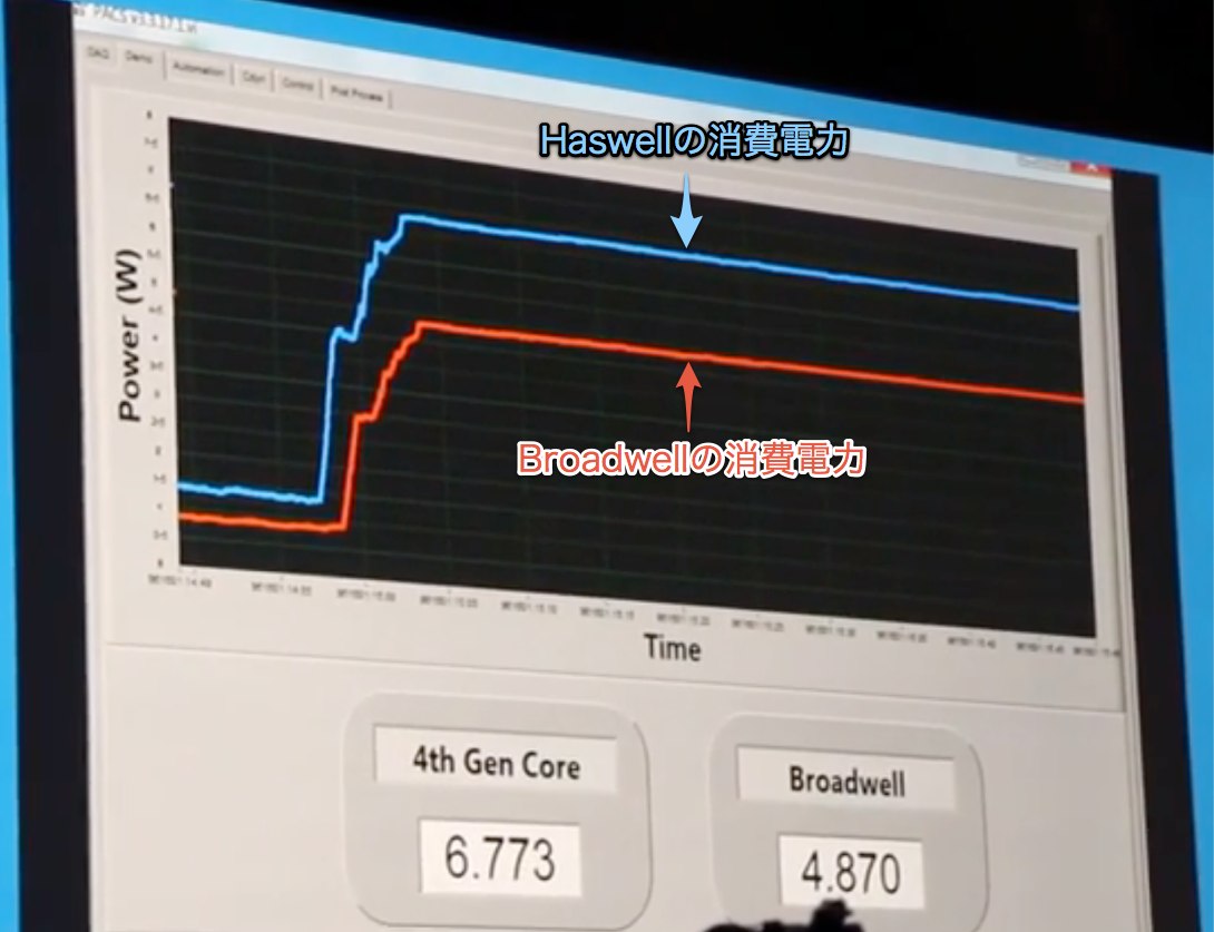 >現行の第4世代Coreプロセッサと比較して同じ処理をさせると30%ほど消費電力が少なくて済むというデモを行なった。