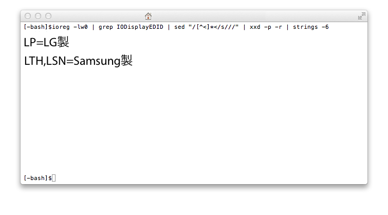 $ioreg -lw0 | grep IODisplayEDID | sed “/[^<]*</s///” | xxd -p -r | strings -6