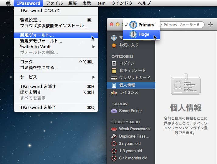 1Password 4からマルチアカウント(ヴォールト)に対応し、ユーザーや設定(仕事やプライベートのアカウントなど)を切り替えて使うことが出来ます。