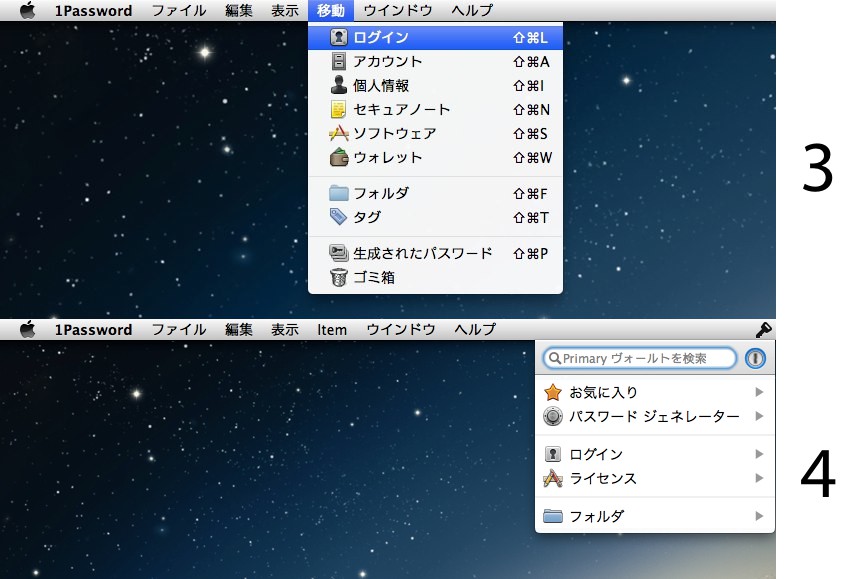 1Password 4には1Password miniというメニューバーユーティリティが追加され、いちいちアプリを起動しなくてもメニューバーに常駐しパスワードデータベースにアクセスできます。