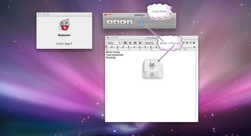 RepeaterはAutomatorやAppleScriptより簡単な「マウスの動き」と「クリック」だけを記録して再生できるアプリです。