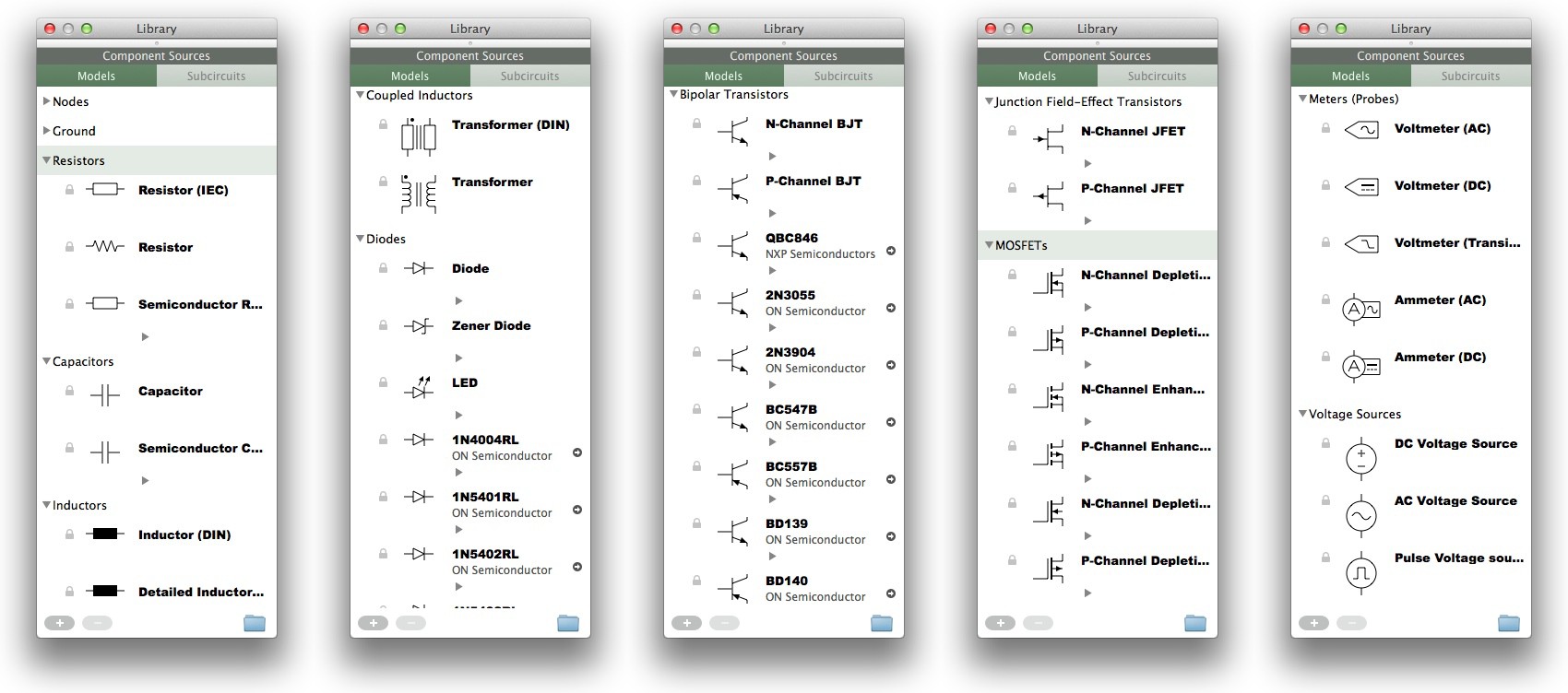 抵抗器 (R)、コイル (L)、コンデンサ (C) 素子はもちろん、ダイオード、MOS、トランジスター、AC、DCソースなど様々な素子が使えます。
