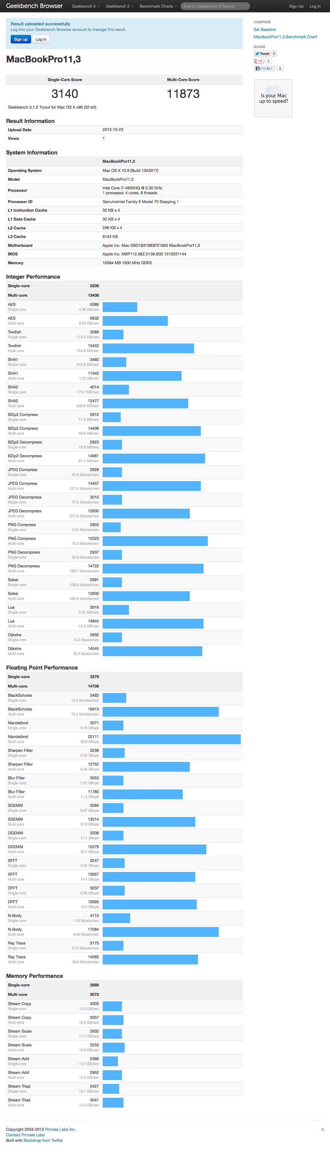 – i7-4850HQ @ 2.3 GHz: Single-Core 3100, Multi-Core 11771