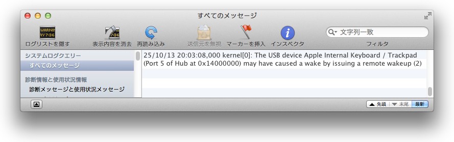 *コンソール.appで確認すると「kernel[0]: The USB device Apple Internal Keyboard / Trackpad (Port 5 of Hub at 0x14000000) may have caused a wake by issuing a remote wakeup」というログが残っている場合もあるそうですが、これが該当のエラーかどうかはわかりません。