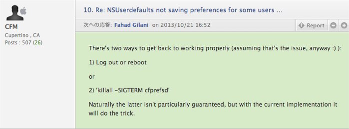 あと、このAppleの中の人、これ関連のForumに「killall -SIGTERM cfprefsdして」って書いてるから、これはどうしようもないんじゃないかな?