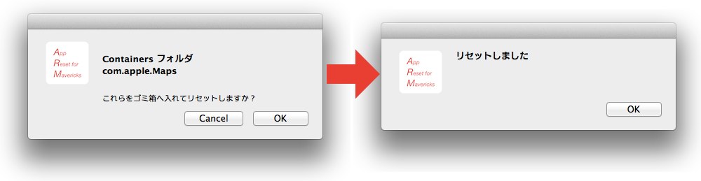[OK]を押すと設定ファイルがゴミ箱に移動されリセットされます。このアプリの流れ、