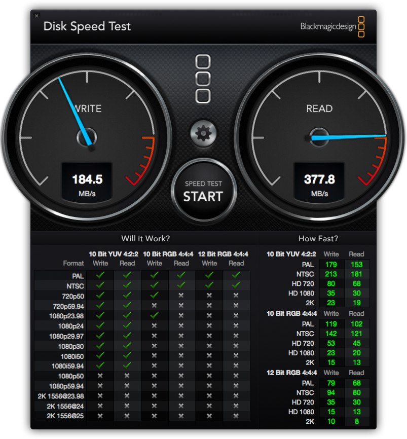 *DiskSpeedTestでWrite 184.5 MB/s・Read 377.8 MB/s