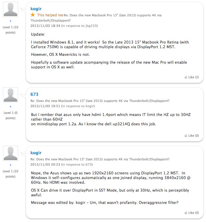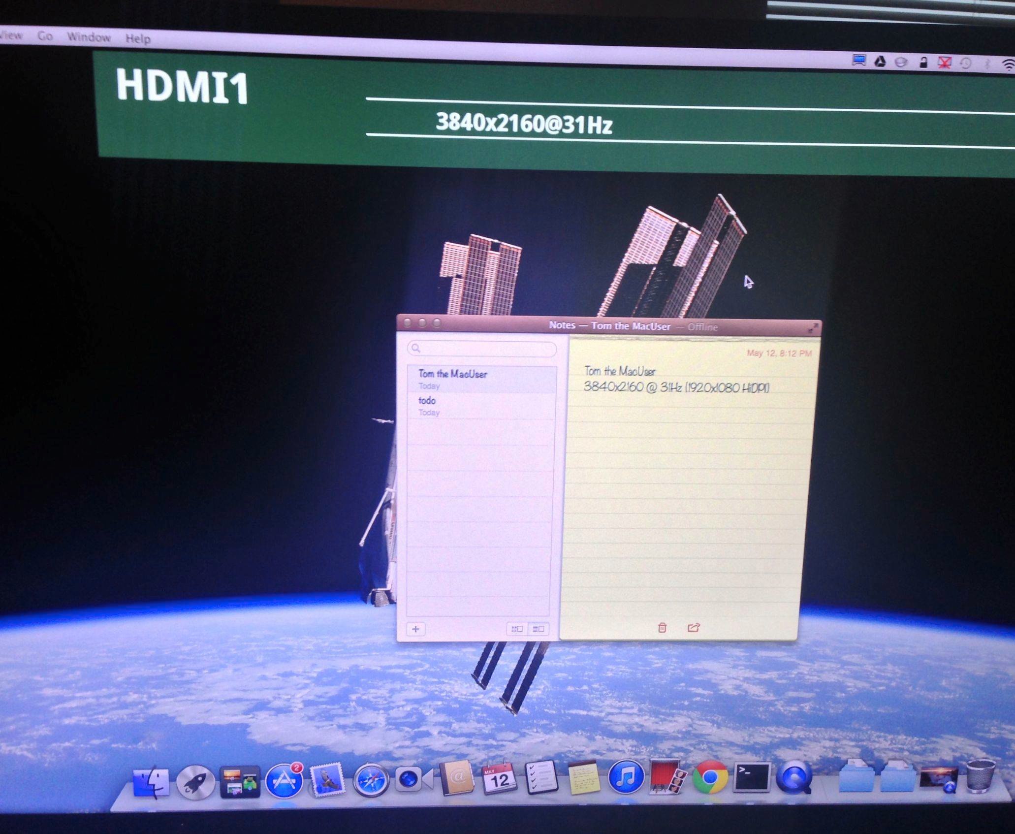 非公式にはMacBook Pro Mid 2012でもBootCampでWindowsをインストールして使用するか、「mac-pixel-clock-patch(Mavericks非対応)」というパッチを当ててSwitchResXアプリで3840×2160@31Hzまで出力可能だそうです。
