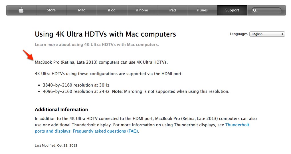 *公式には一応3840×2160@30Hz、4096×2160@24Hzと記載されています。MacBook Pro (Retina, Late 2013) computers can use 4K Ultra HDTVs.