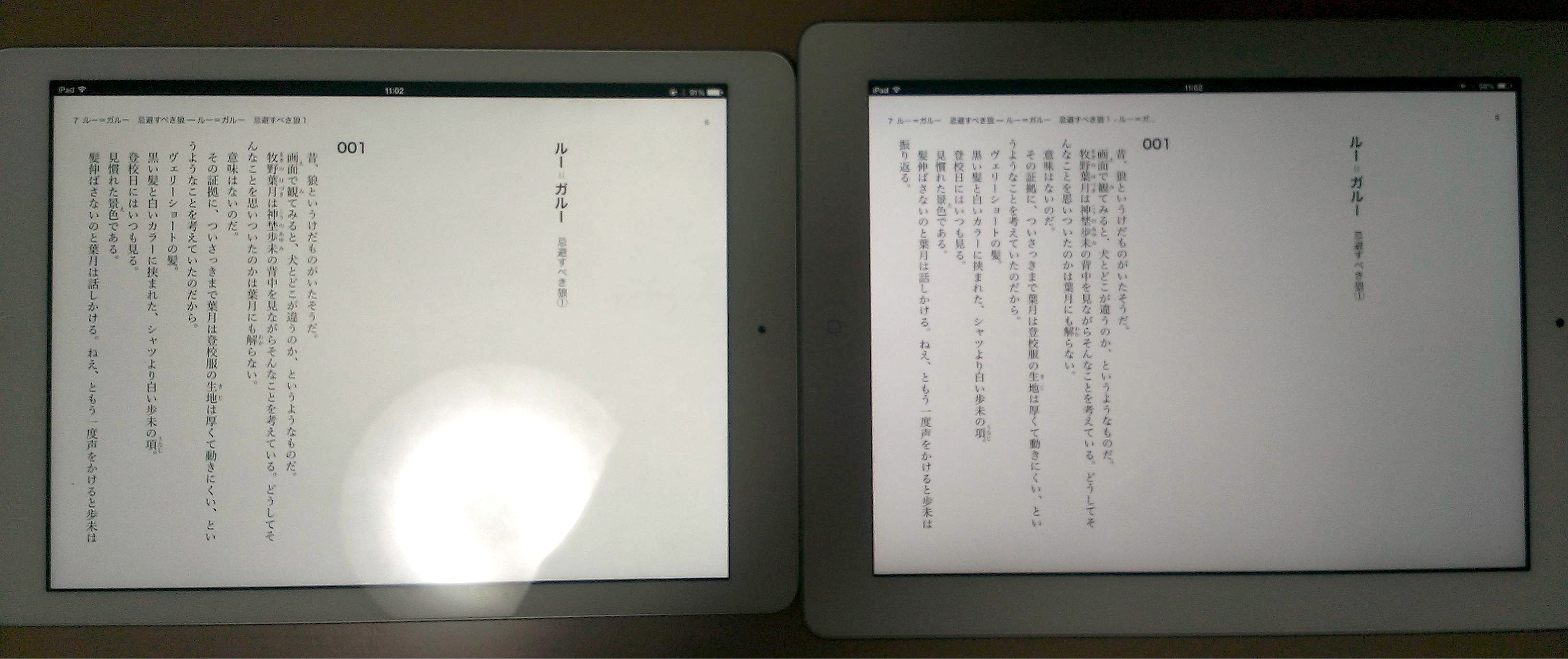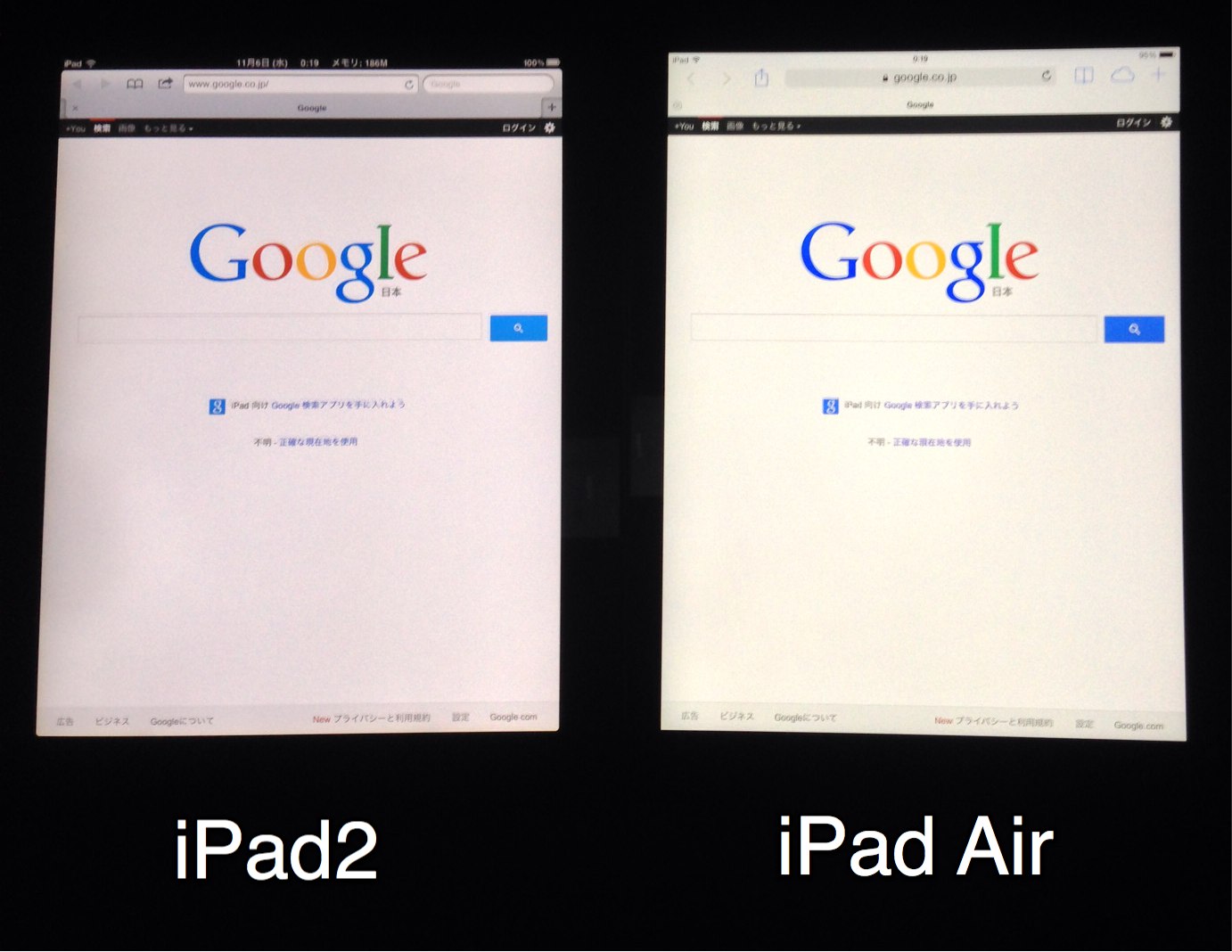 iPad2との比較だけど、あきらかに、airのほうが、液晶が暗いし