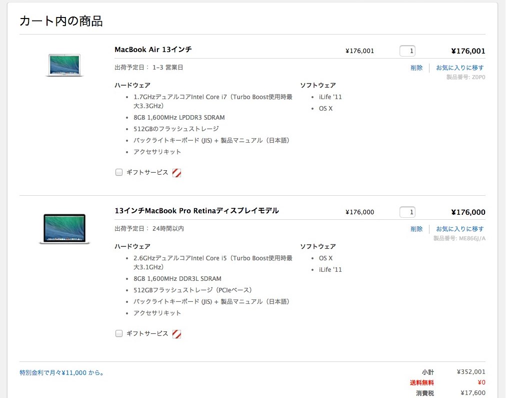 MacBook Air現在、MacBook Pro Retina 13インチ梅モデルが10万円代へ突入し、MacBook Air 13インチ梅モデルが8万円で購入者は価格差2万円と220gの重さ、Retinaディスプレイなどのスペックと比較してかなり悩んでいるようです。詳細は以下から。