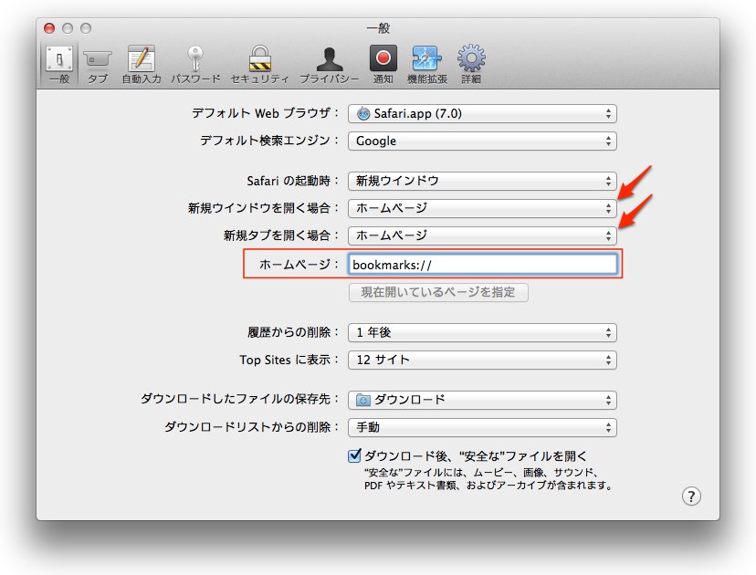 5.さらに、Safariの[環境設定…]から「ホームページ」にbookmarks://やtopsites://、history://などを登録しておくと、新規ウィンドウやタブを開く時に特定の表示メニューを開けます。
