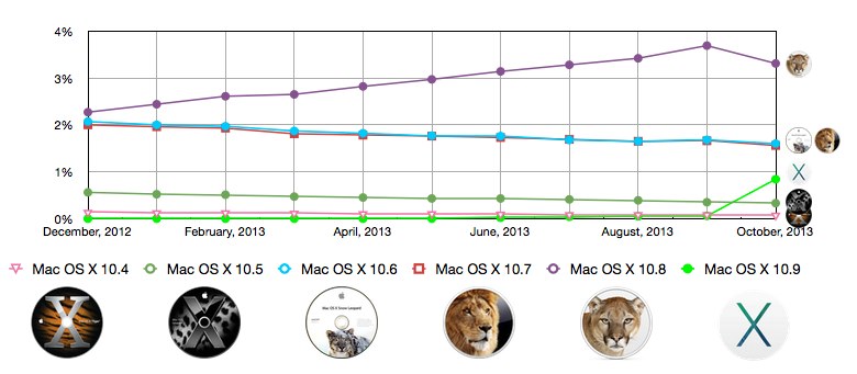 Market Share ReportsのOS X Web trafficをグラフ化してみても、Mavericksがリリースされてからのスパイクが一番鋭いのがOS X 10.8 Mountain Lion(9月から比べて0.38%の減)でOS X 10.6,10.7は0.08%~0.1%ほどの減少におさまっているようです。