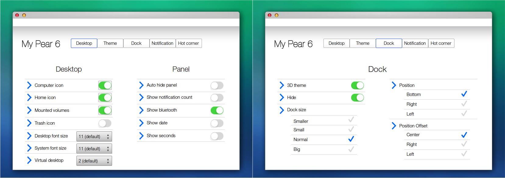 2.デスクトップやDockの設定は「MyPear6」で行い、NotificationやHot cornerの機能も使用できます。トグルスイッチはiOS 7風です。