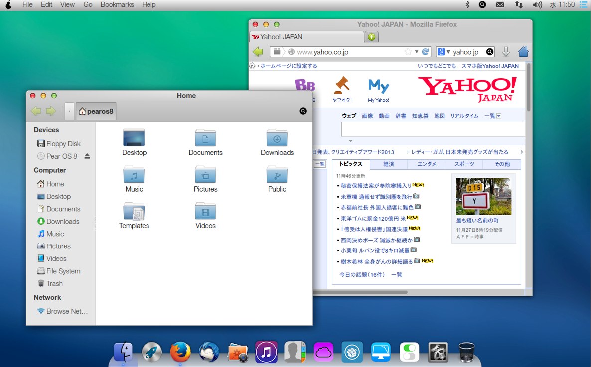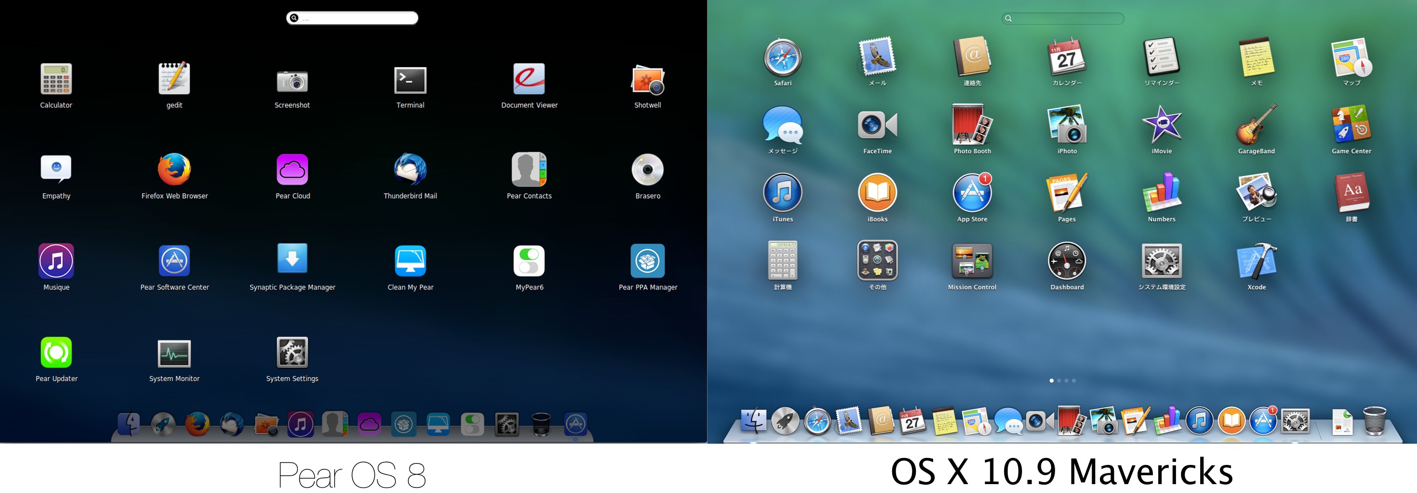 Pear OS 8 Linuxは32bit/64bit版(1.1 GB程度)が用意されており、ライブディストリビューションにも対応しているので使ってみました。(unameではUbuntu 12 + kernel 3.8ベース)