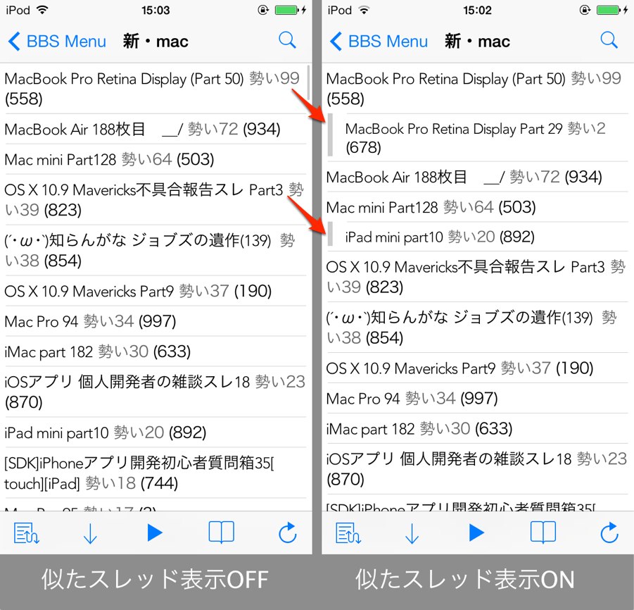 似たスレッド表示を並べて表示機能は[設定]>[表示の設定]からON/OFF可能です。