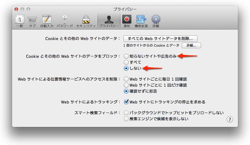 この問題を解決するには、「Safari」メニューから「環境設定」>「プライバシー」を選択します。次に、「Cookie をブロック」で「常に」以外のオプションを選択します。*Safari6.1, 7以上の場合は「Cookeとその他のWebサイトのデータをブロック」